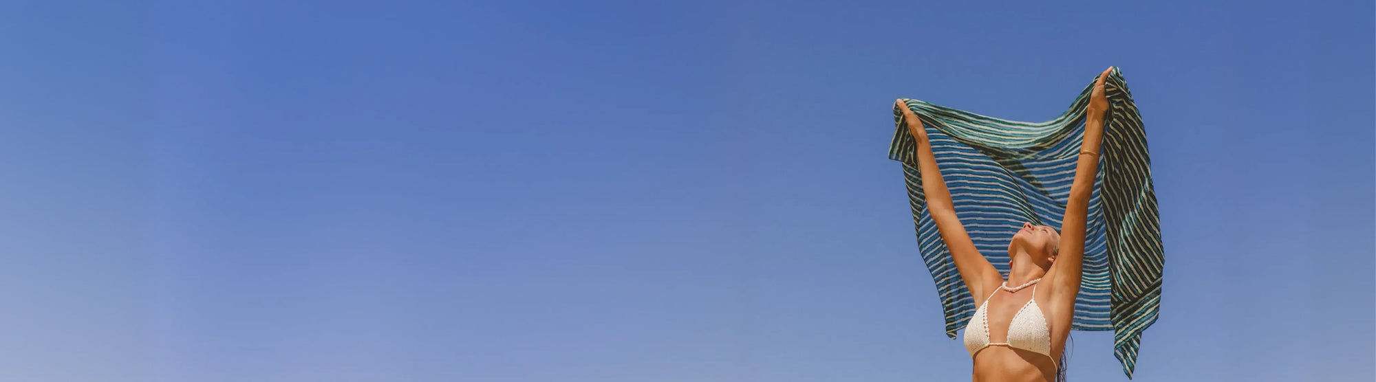 Ria Sarong Sky — full length front view standing on sandy beach, sky blue hand block print cotton sarong with white lotus motifs tied at waist, white bikini top, dark volcanic rock wall backdrop | Daughters of India Ria Sarong Sky — model seated on volcanic rock, sky blue hand block print cotton sarong wrapped at waist, white bikini top, dark stone wall coastal beach backdrop | Daughters of India