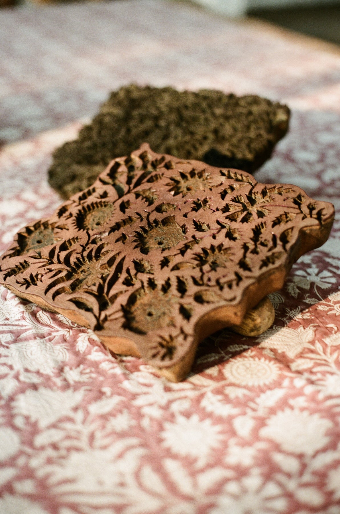 Daughters of India Kyra Midi Dress in Musk — studio with straw hat, side profile, hand screen print cotton