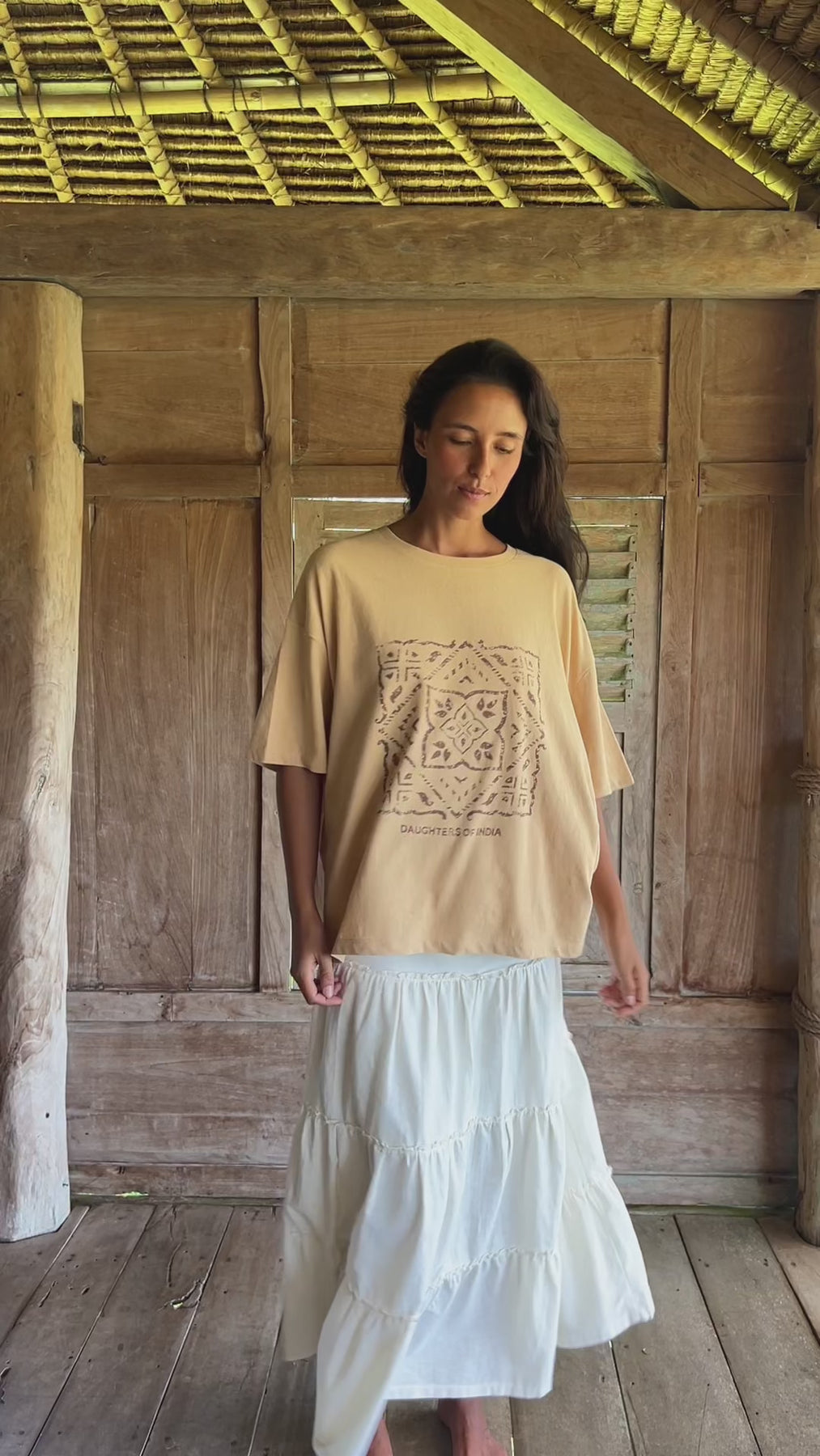 Full-length view of woman wearing the Daughters of India Shanti Tee in Cashew with a white tiered maxi skirt in a rustic wooden interior