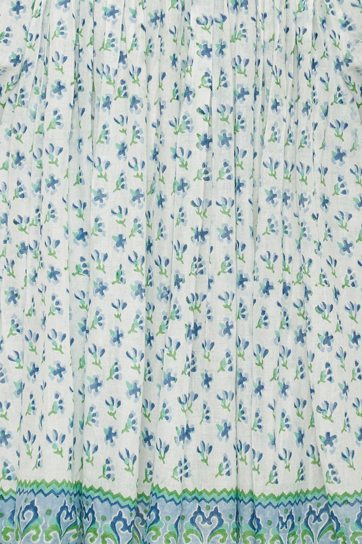 Our signature Kyra Dress in a mini length, delicately adorned with traditional hand-block printed blooms in blue hues, each petal and pattern tell a story of beauty and elegance.