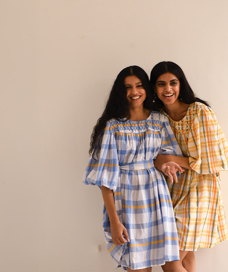 Freya Dress Periwinkle Blue Plaid — full length by terracotta pots and white walls, hand-smocked neckline, billowy sleeves, handloom woven periwinkle blue plaid mini, artisan boho dress | Daughters of India Freya Dress Periwinkle Blue Plaid — upper body close-up showing hand-smocked neckline panel with gold thread detail, handloom woven periwinkle blue plaid with yellow accent, artisan craftsmanship | Daughters of India