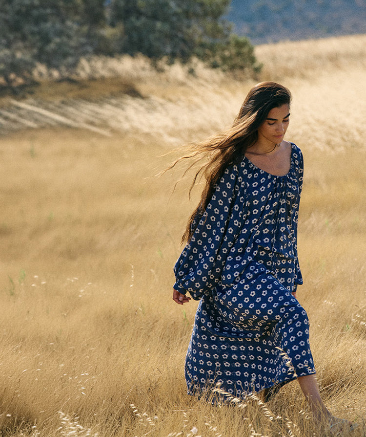 Zahra Midi Dress in Indigo — hand block print linen midi dress | Daughters of India Zahra Midi Dress Indigo — billowing sleeve detail, hand block print cotton | Daughters of India