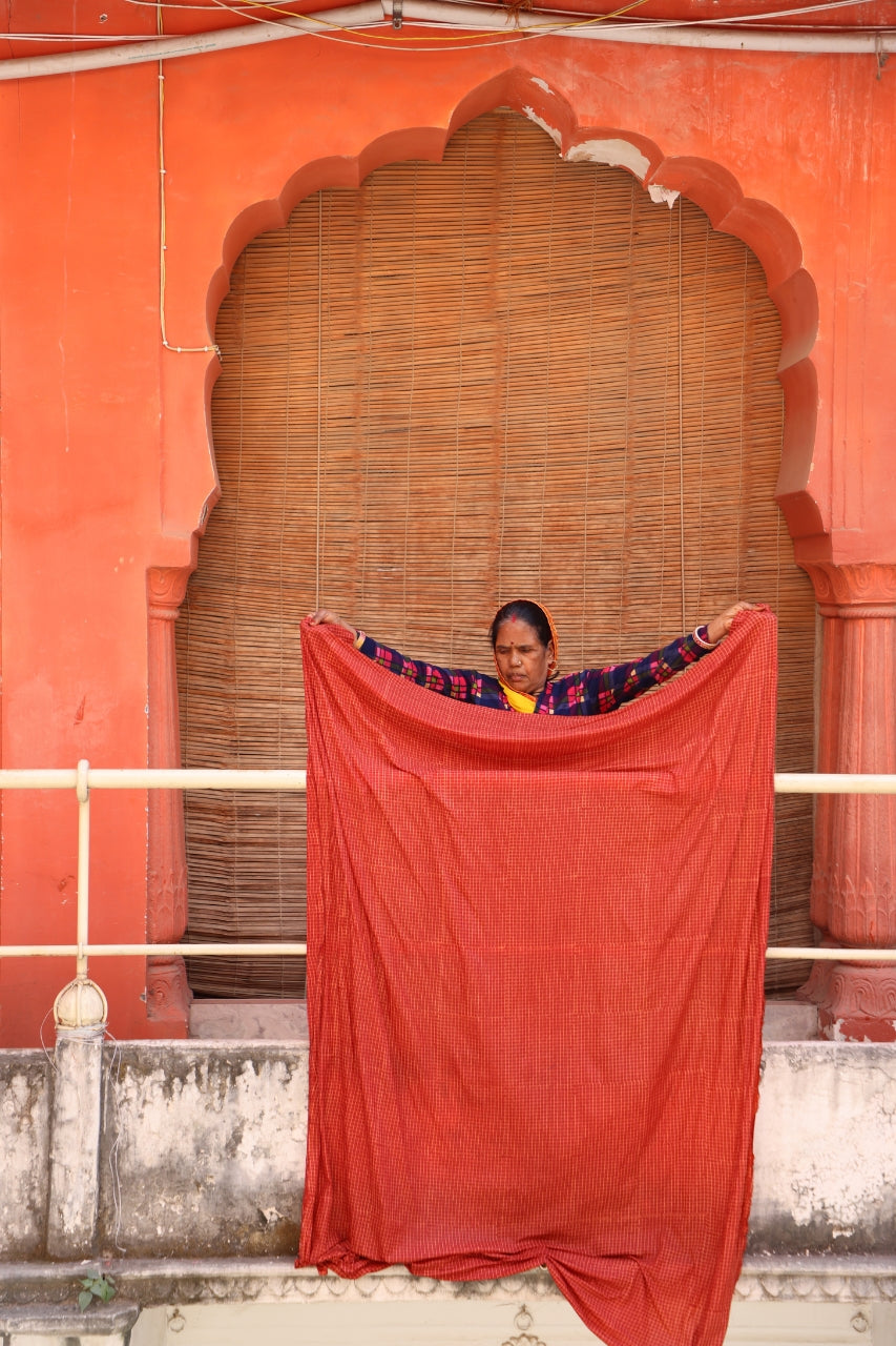The Sundress Midi in Marmalade features a warm, sun-drenched terracotta adorned with a delicate hand screen-printed grid — fine white lines forming a gentle check pattern across the fabric, beautifully subtle and unmistakably handcrafted. With a sleeveless silhouette, adjustable tie gathering at the neckline, decorative trim along the sleeves & hem, and convenient pockets, it's perfect for warm summer days or layered during the cooler months.